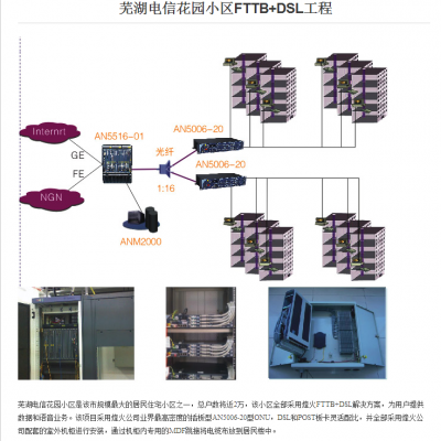 案例內(nèi)容:蕪湖電信花園小區(qū)是該市規(guī)模最大的居民住宅小區(qū)之一,總戶數(shù)將近2萬,該小區(qū)全部采用烽火FTTB+DSL解決方案,為用戶提供數(shù)據(jù)和語音業(yè)務(wù)。該項(xiàng)目采用烽火公司業(yè)界最高密度的插板型AN5006-20型ONU,DSL和POST板卡靈活配比,并全部采用烽火公司配套的室外機(jī)柜進(jìn)行安裝,通過機(jī)柜內(nèi)專用的MDF跳接將電纜布放到居民樓中。