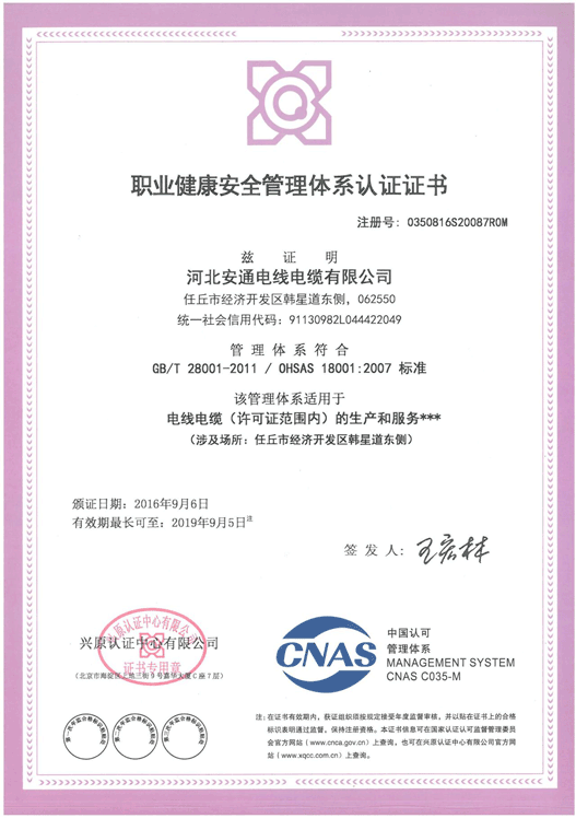 職業(yè)健康安全管理體系認證證書