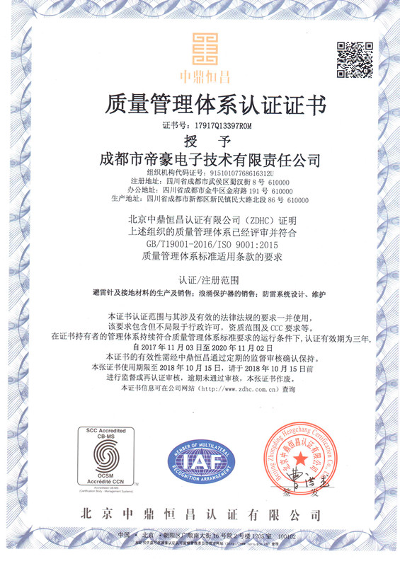 成都市帝豪電子技術(shù)有限責(zé)任公司-于2004年11月成立,總部設(shè)在四川成都。十年勵(lì)精圖治,奮發(fā)圖強(qiáng),帝豪防雷現(xiàn)已榮獲ISO9001-2008國(guó)際質(zhì)量管理體系認(rèn)證,質(zhì)量、服務(wù)、信譽(yù)AAA企業(yè)稱(chēng)號(hào),并獲得多項(xiàng)外觀專(zhuān)利及實(shí)用新型專(zhuān)利,是國(guó)內(nèi)較早提出五年質(zhì)保防雷企業(yè)。成都市帝豪電子技術(shù)有限責(zé)任公司按照服務(wù)社會(huì)、造福人類(lèi)的企業(yè)宗旨,貫徹務(wù)實(shí)創(chuàng)新、凝聚奉獻(xiàn)的企業(yè)理念,勤勤懇懇做事,踏踏實(shí)實(shí)做人的企業(yè)風(fēng)格,經(jīng)過(guò)全體員工的努力,現(xiàn)以立足于雷電電磁脈沖綜合防護(hù)、過(guò)電壓防護(hù)、接地保護(hù)、電磁屏蔽領(lǐng)域,集防雷產(chǎn)品研發(fā)、生產(chǎn)、銷(xiāo)售與防雷工程勘測(cè)、設(shè)計(jì)、施工、維護(hù)為一體,擁有自主知識(shí)產(chǎn)權(quán)的專(zhuān)業(yè)化高新技術(shù)企業(yè)。以引領(lǐng)行業(yè)標(biāo)準(zhǔn)的專(zhuān)業(yè)化工程設(shè)計(jì)、實(shí)施及服務(wù)能力面向多領(lǐng)域用戶(hù),提供一體化解決方案。 公司生產(chǎn)的電源避雷器、信號(hào)避雷器、天饋避雷器、避雷針及接地五大系列200余款產(chǎn)品廣泛應(yīng)用于通信、氣象、金融、廣播電視、電力、航天航點(diǎn)擊查看