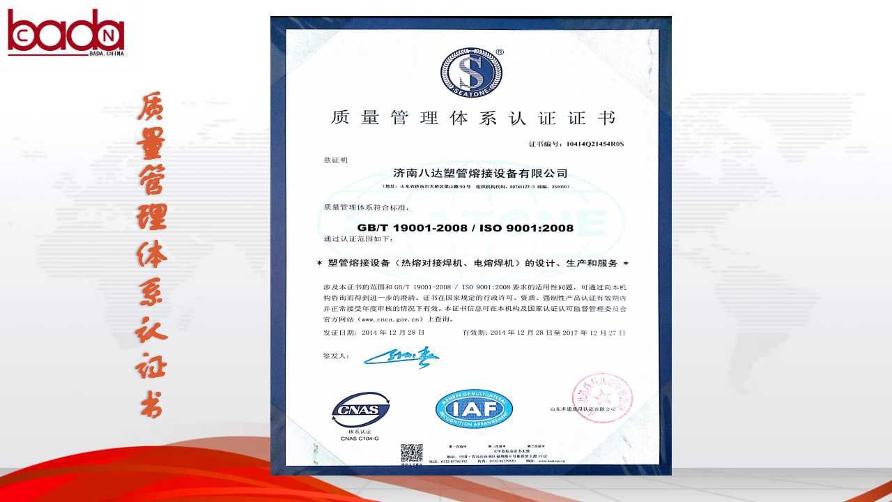 濟南八達塑管熔接設備有限公司專業(yè)生產(chǎn)、銷售“八達”品牌的熱熔對接焊機、全自動熱熔對接焊機、管件熱熔對接焊機、馬鞍形異徑熱熔對接焊機、塑料管道多角度切割鋸、電熔焊機、手持承插焊機、以及各種施工專用輔助工具等多種型號和系列的產(chǎn)品。產(chǎn)品被國內(nèi)各管材、管件生產(chǎn)廠家、自來水公司、燃氣公司、專業(yè)施工單位等廣泛使用,并以其優(yōu)秀的性價比和可靠的質(zhì)量贏得了市場的廣泛青睞。點擊查看