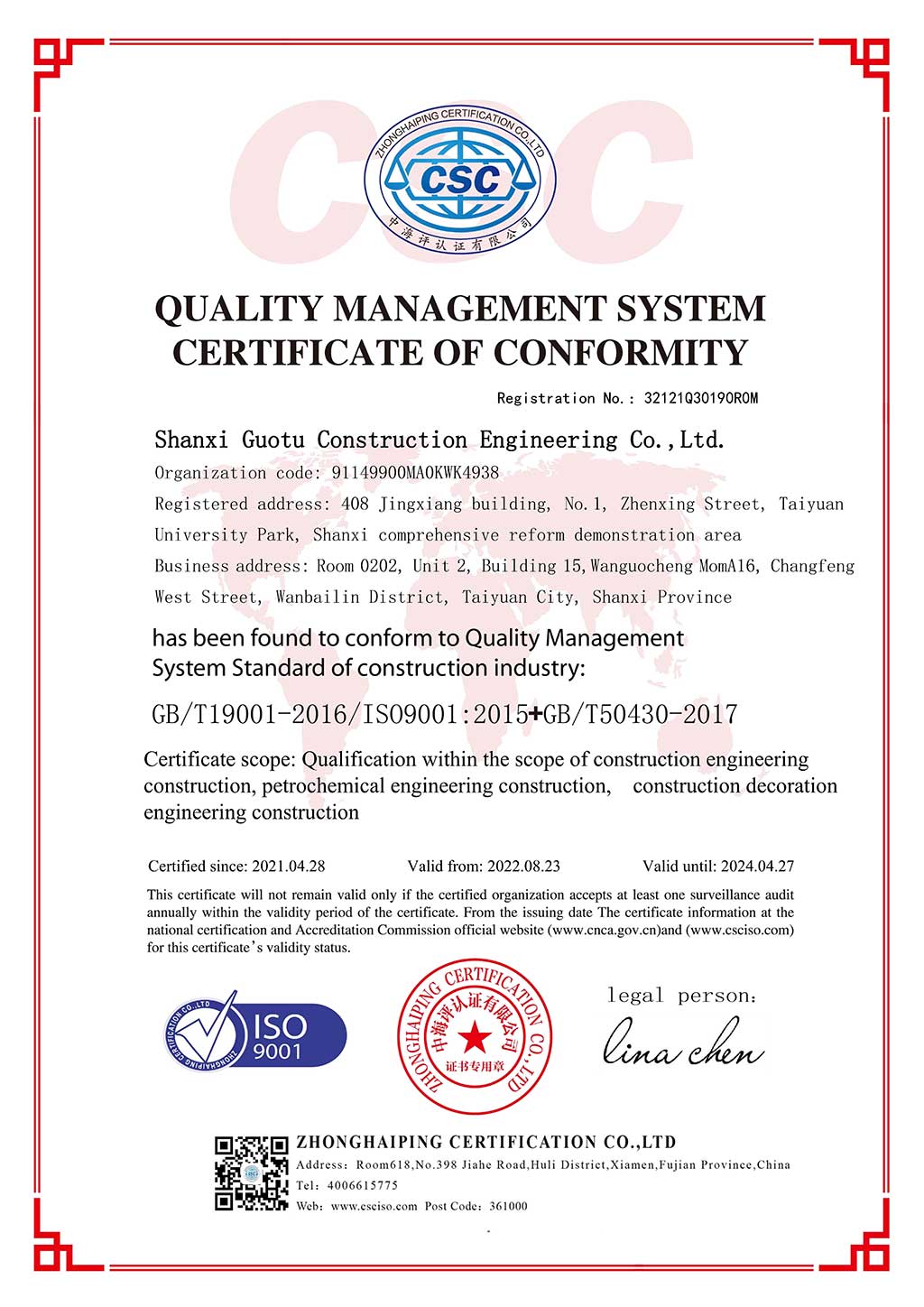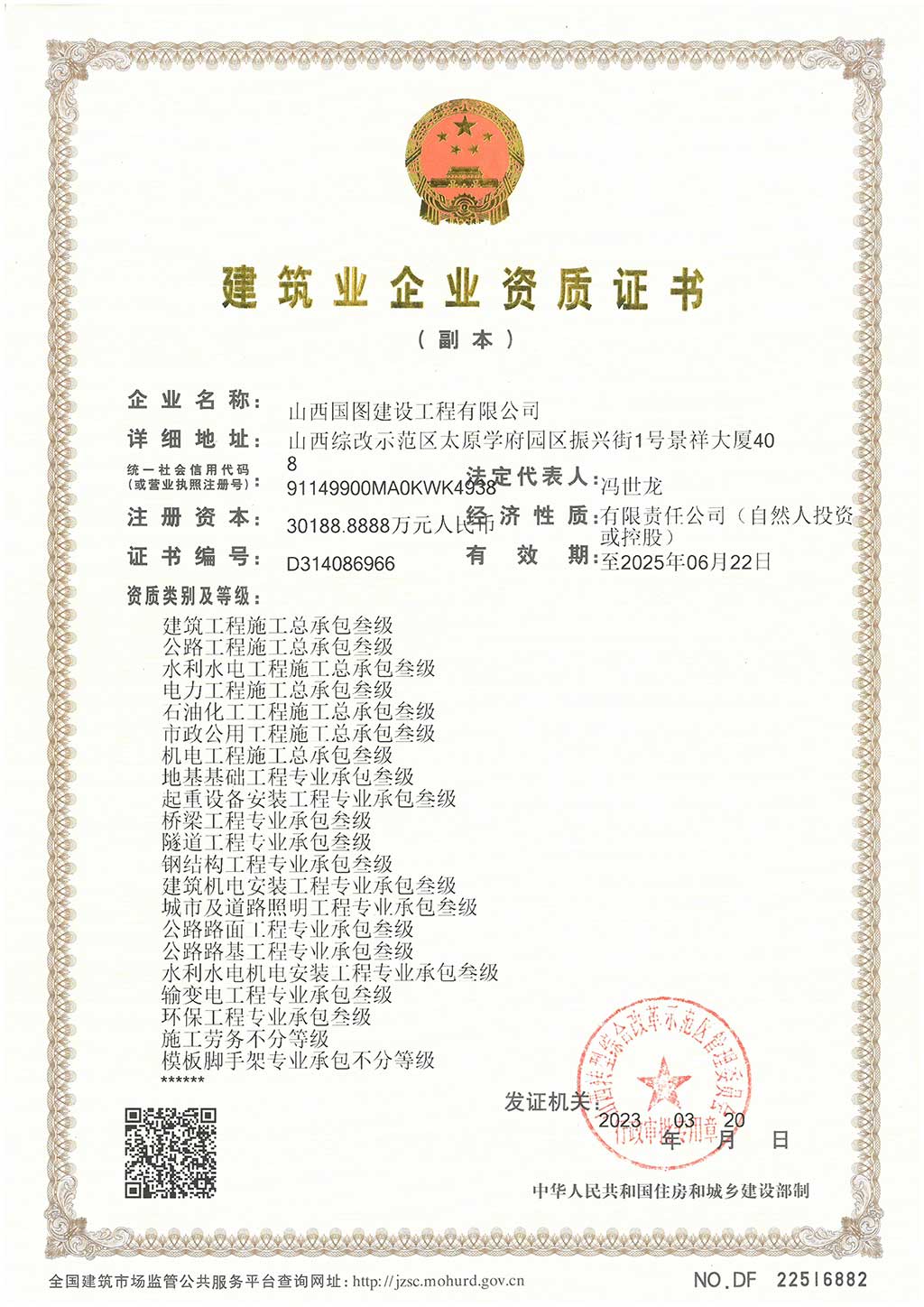 山西國(guó)圖建設(shè)工程有限公司成立于2019年12月30日,為國(guó)家房屋建筑施工總承包叁級(jí)資質(zhì),注冊(cè)資金30188.8888萬(wàn)元,是房屋建筑、建筑裝修裝飾工程等為一體的綜合型公司,能承接各種大、中型工業(yè)與民用建筑的施工安裝任務(wù)。 近年來(lái),公司自組建以來(lái),秉承“爭(zhēng)創(chuàng)第一——團(tuán)結(jié)、拼搏、開(kāi)拓、爭(zhēng)先”的企業(yè)精神,以從事完全競(jìng)爭(zhēng)性的建筑業(yè)為核心業(yè)務(wù)。 公司本著:“以質(zhì)量求信譽(yù),以信譽(yù)求發(fā)展,以發(fā)展求生存”的宗旨,建立健全了一套先進(jìn)的質(zhì)量管理體系,制定了合理的質(zhì)量管理制度,形成縱橫交叉的質(zhì)量監(jiān)控網(wǎng)絡(luò)。為推動(dòng)質(zhì)量管理機(jī)制的科學(xué)規(guī)范運(yùn)行,公司實(shí)行經(jīng)理掛帥,質(zhì)檢處與施工隊(duì)、質(zhì)檢員組成質(zhì)保體系逐級(jí)負(fù)責(zé),層層把關(guān),使每個(gè)工程、工點(diǎn)、工種、工序的質(zhì)量自檢縱橫交叉,互測(cè)互檢,不留空檔,使生產(chǎn)施工的全過(guò)程始終處在嚴(yán)格的質(zhì)量監(jiān)督當(dāng)中。 同時(shí),在全國(guó)部分城市設(shè)立了分支機(jī)構(gòu)。從而為企業(yè)的進(jìn)一步發(fā)展,拓展了廣闊的空間,奠定了良點(diǎn)擊查看