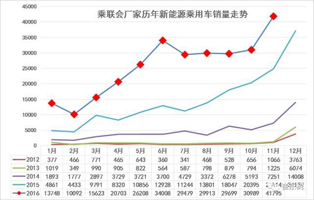 16年3-6月的持續(xù)拉升走勢暫停,7-10月進入穩(wěn)定期,11月進入年末拉升期。隨著新能源車政策調(diào)整,3季度乘用車市場處于整固期,增速不斷放緩,11月市場逐步恢復。11月的新能源車銷量41795臺,同比15年11月的24814臺增長68%,增速高于9月的65%和10月的52%。