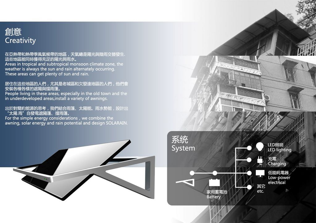 在亞熱帶和熱帶季風(fēng)氣候帶的地區(qū),天氣總是陽光與陰雨交替發(fā)生.這些地區(qū)能同時(shí)獲得充足的陽光與雨水。居住在這些地區(qū)的人們,尤其是老城區(qū)和欠發(fā)達(dá)地區(qū)的人們,他們會(huì)安裝各種各樣的遮陽與擋雨篷。出于對(duì)簡約能源的思考,我們結(jié)合雨篷、太陽能。雨水勢(shì)能,設(shè)計(jì)出“太陽.雨”自發(fā)電遮陽篷、擋雨篷。