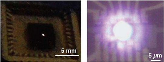 從懸浮石墨烯材料發(fā)出可見光的光學(xué)(左)和顯微(右)圖像。由美國哥倫比亞大學(xué)、韓國首爾國立大學(xué)、韓國標(biāo)準(zhǔn)與科學(xué)研究院的研究人員組成的科學(xué)家團(tuán)隊(duì)創(chuàng)造出世界上最微小的石墨烯燈泡