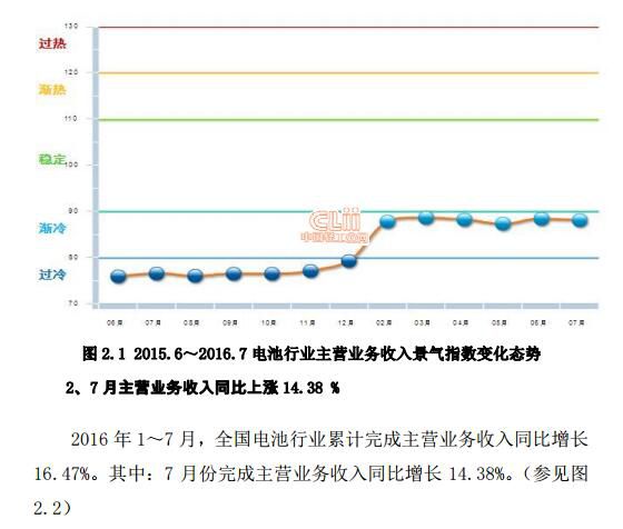 2014年10月至2015年12月,電池主營(yíng)業(yè)務(wù)收入景氣指數(shù)一直在“過冷”提示區(qū)運(yùn)行,2016年2月起連續(xù)6月在“漸冷”提示區(qū)。