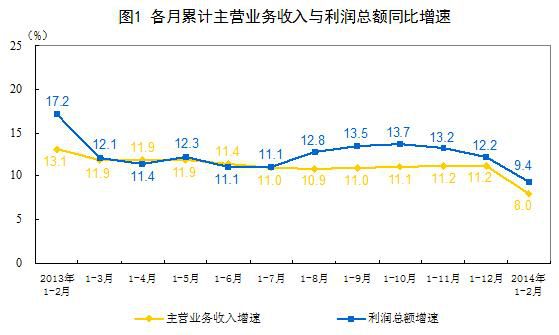 1-2月份,全國規(guī)模以上工業(yè)企業(yè)實現(xiàn)利潤總額7793.1億元,同比增長9.4%,其中,主營活動利潤7395.9億元,同比增長8.4%。