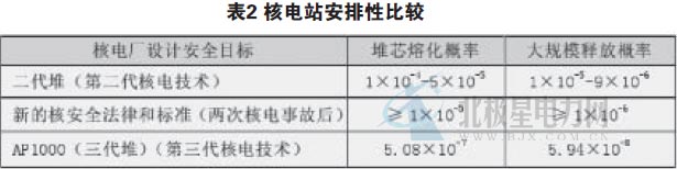 核電站安全目標(biāo)有兩個指標(biāo),一是反應(yīng)堆堆芯熔化率(簡稱堆熔概率),二是大規(guī)模釋放放射性物質(zhì)的概率(簡稱釋放概率)。如果以每核反應(yīng)堆每年來計算的話,二代堆的堆熔概率為10-4,也就是每堆每年出現(xiàn)萬分之一的可能性;而釋放概率為10-5,也就是每堆每年有10萬分之一的可能會發(fā)生核物質(zhì)大規(guī)模釋放。第三代核電機(jī)組要有更高安全目標(biāo)。即堆芯熱工安全裕量>l5%,堆芯損壞概率<10-5/堆年,大量放射性外泄<10-6/堆年。兩次核電事故后,法規(guī)和標(biāo)準(zhǔn)對安全目標(biāo)的要求又提高了,而AP1000的安全目標(biāo)比前兩者更高,具體見附表2。