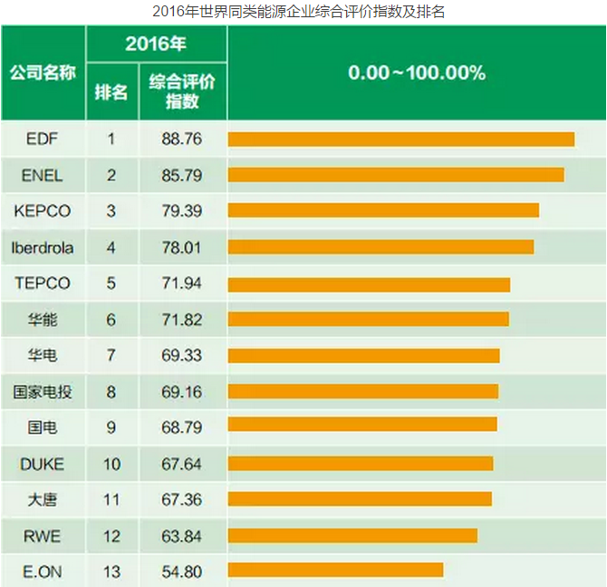 2016年,13家對(duì)標(biāo)企業(yè)綜合評(píng)價(jià)指數(shù)排名依次為:法國(guó)電力公司(EDF)、意大利國(guó)家電力公司(Enel)、韓國(guó)電力公司(KEPCO)、西班牙伊維爾德羅拉公司(Iberdrola)、東京電力公司(TEPCO)、華能、華電、國(guó)家電投、國(guó)電、美國(guó)杜克能源公司(Duke)、大唐、德國(guó)萊茵公司(RWE)和德國(guó)意昂公司(E.ON)。