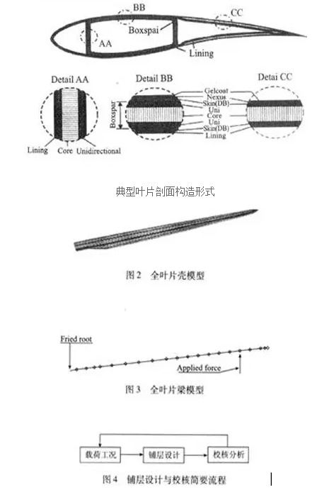 結(jié)構(gòu)鋪層校核對葉片結(jié)構(gòu)設(shè)計(jì)來說也必不可少。前在校核方面,大多用通用商業(yè)有限元軟件,比如ANSYS、NASTRAN、ABAQUS等。對葉片進(jìn)行校核時,考慮單層的極限強(qiáng)度、自振頻率和葉尖撓度,分析模型有殼模型和梁模型等,并且能夠做到這兩種模型的相互轉(zhuǎn)換,如圖2,3所示。與其他葉片結(jié)構(gòu)相比,目前大型葉片的中空夾芯結(jié)構(gòu)具有很高的抗屈曲失穩(wěn)能力,較高的自振頻率,這樣設(shè)計(jì)出來的葉片相對較輕。有限元法可用于設(shè)計(jì),但更多用于模擬分析而不是設(shè)計(jì),設(shè)計(jì)與模擬必須交叉進(jìn)行,在每一步設(shè)計(jì)完成后,必須更新分析模型,重新得到鋪層中的應(yīng)力和應(yīng)變數(shù)據(jù),再返回設(shè)計(jì),更改鋪層方案,再分析應(yīng)力和變形等,直到滿足設(shè)計(jì)標(biāo)準(zhǔn)為止,如圖4所示。因?yàn)閺?fù)合材料正交各向異性的特殊性,葉片各鋪層內(nèi)的應(yīng)力并不連續(xù),而應(yīng)變則相對連續(xù),所以葉片結(jié)構(gòu)校核的失效準(zhǔn)則有時候完全采用應(yīng)變失效準(zhǔn)則。?