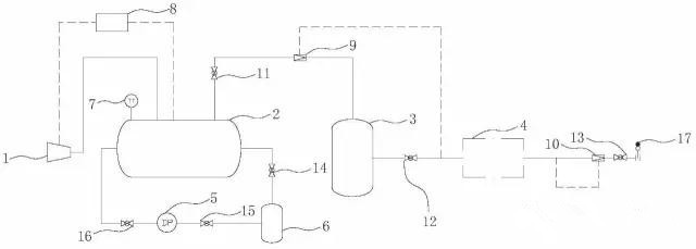 為了實(shí)現(xiàn)上述目的,本發(fā)明采用如下技術(shù)方案:一種模擬氣體閥門內(nèi)漏的試驗(yàn)裝置,包括主管線、儀表管線、壓力信號線和控制信號線,還包括空氣壓縮機(jī)、儲氣罐、緩沖罐、試驗(yàn)閥門組、差壓計(jì)、參比罐、溫度計(jì)、空壓機(jī)控制系統(tǒng)、第一調(diào)壓閥、第二調(diào)壓閥、第一閥門、第二閥門、第三閥門、第一儀表閥門、第二儀表閥門、第三儀表閥門以及第六“8”字型盲板,所述空氣壓縮機(jī)、儲氣罐、第一閥門、第一調(diào)壓閥、緩沖罐、第二閥門、試驗(yàn)閥門組、第二調(diào)壓閥、第三閥門和第六“8”字型盲板通過主管線依次連接,所述儲氣罐、第一儀表閥門、參比罐、第二儀表閥門、差壓計(jì)和第三儀表閥門通過儀表管線依次連接,所述溫度計(jì)設(shè)置在儲氣罐之上,所述空氣壓縮機(jī)和空壓機(jī)控制系統(tǒng)通過控制信號線連接。