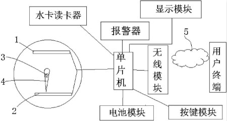 本實用新型通過包括有脈沖水表以及與所述脈沖水表相連接的抄表單元,所述抄表單元通過無線網(wǎng)絡(luò)連接用戶終端,所述脈沖水表包括用于通過閉合而發(fā)送脈沖信號的第一干簧管以及第二干簧管,所述第一干簧管以及第二干簧管相對平行設(shè)置在脈沖水表的磁針的兩側(cè),所述抄表單元包括單片機(jī)以及與所述單片機(jī)連接的無線模塊、水卡讀卡器、按鍵模塊、顯示模塊;所述第一干簧管以及第二干簧管與所述單片機(jī)的脈沖信號接收端相連接,可以通過脈沖水表的第一干簧管以及第二干簧管發(fā)送兩次信號給抄表單元的單片機(jī),由單片機(jī)根據(jù)兩次信號進(jìn)行計數(shù),提高了計數(shù)的準(zhǔn)確性,且可通過抄表單元向用戶終端發(fā)送用水量信息或數(shù)據(jù),使得用戶可以隨時了解自己的用水情況,及時進(jìn)行充值或繳費。