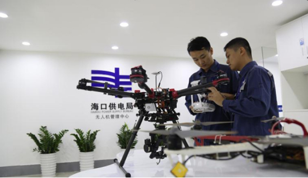 海口供電局員工在學習無人機操控流程。 姚其欣 攝