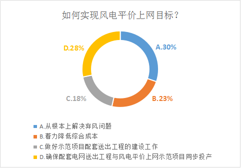 從數(shù)據(jù)統(tǒng)計(jì)上看,30%的網(wǎng)友認(rèn)為實(shí)現(xiàn)風(fēng)電平價(jià)上網(wǎng)要從根本解決棄風(fēng)問題,28%的網(wǎng)友認(rèn)為需要確保配套電網(wǎng)送出工程與風(fēng)電平價(jià)上網(wǎng)示范項(xiàng)目同步投產(chǎn),所占比例非常接近;23%的網(wǎng)友認(rèn)為重點(diǎn)在于著力降低綜合成本,18%的網(wǎng)友認(rèn)為要做好示范項(xiàng)目配套送出工程的建設(shè)工作。