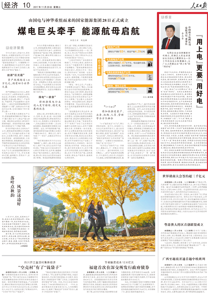 11月29日,人民日報10版“感言”欄目刊發(fā)南方電網(wǎng)公司黨組書記、董事長李慶奎署名文章:《“用上電”更要“用好電”》。