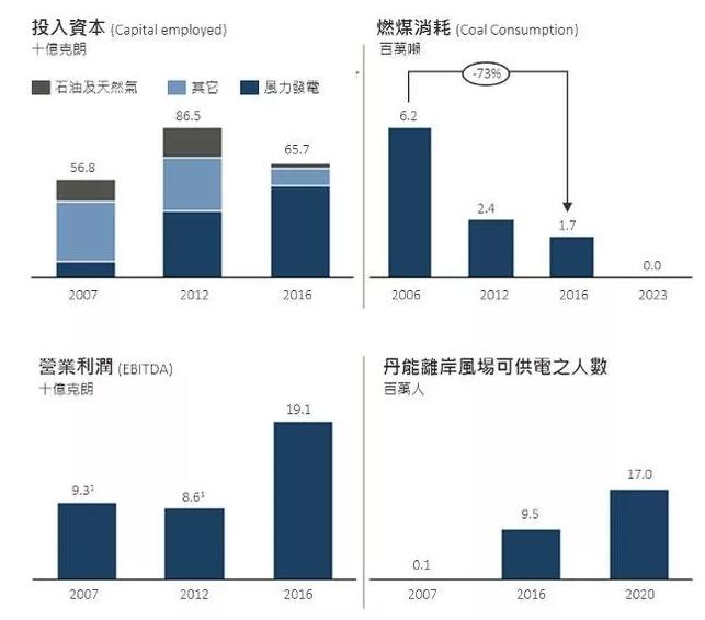過去十年間,丹能集團從一家依靠燃煤和石油的傳統(tǒng)能源公司,轉型為再生能源的全球領導者。在公司收益也大幅增加時,也不斷減少燃煤使用和持續(xù)建造新的離岸風場(詳情如下圖)。從 2006 年起我們的碳排放量已經(jīng)減少 52%,預計 2023 年將會比 2006 年的基準再減少 96%。