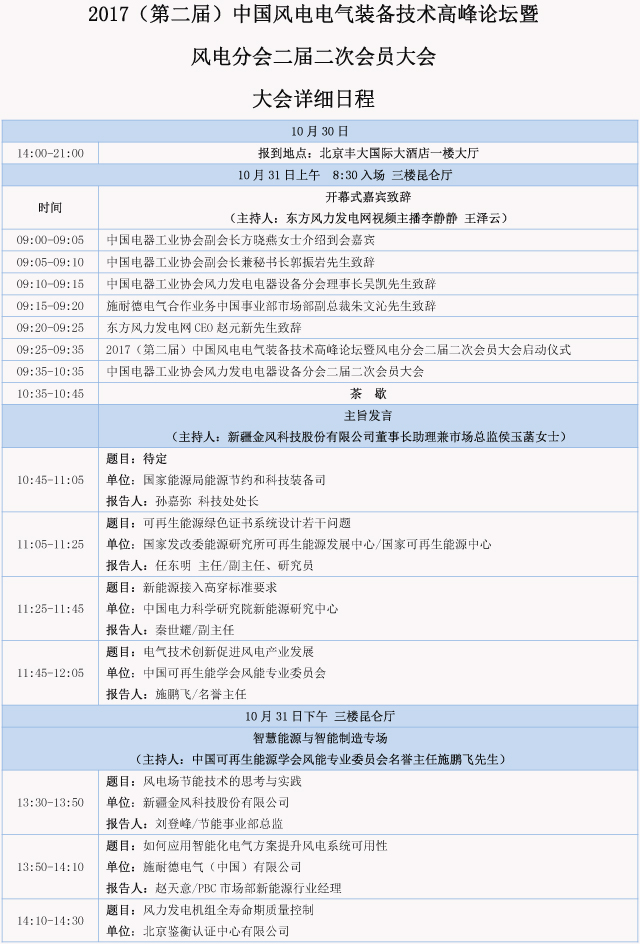 2017(第二屆)中國風(fēng)電電氣裝備技術(shù)高峰論壇暨風(fēng)電分會二屆二次會員大會詳細(xì)日程正式發(fā)布啦!本屆大會以“智慧能源•智能制造•產(chǎn)業(yè)升級”為主題加快我國風(fēng)電電氣裝備的智能制造和創(chuàng)新發(fā)展,推動風(fēng)電行業(yè)的產(chǎn)業(yè)升級換代。