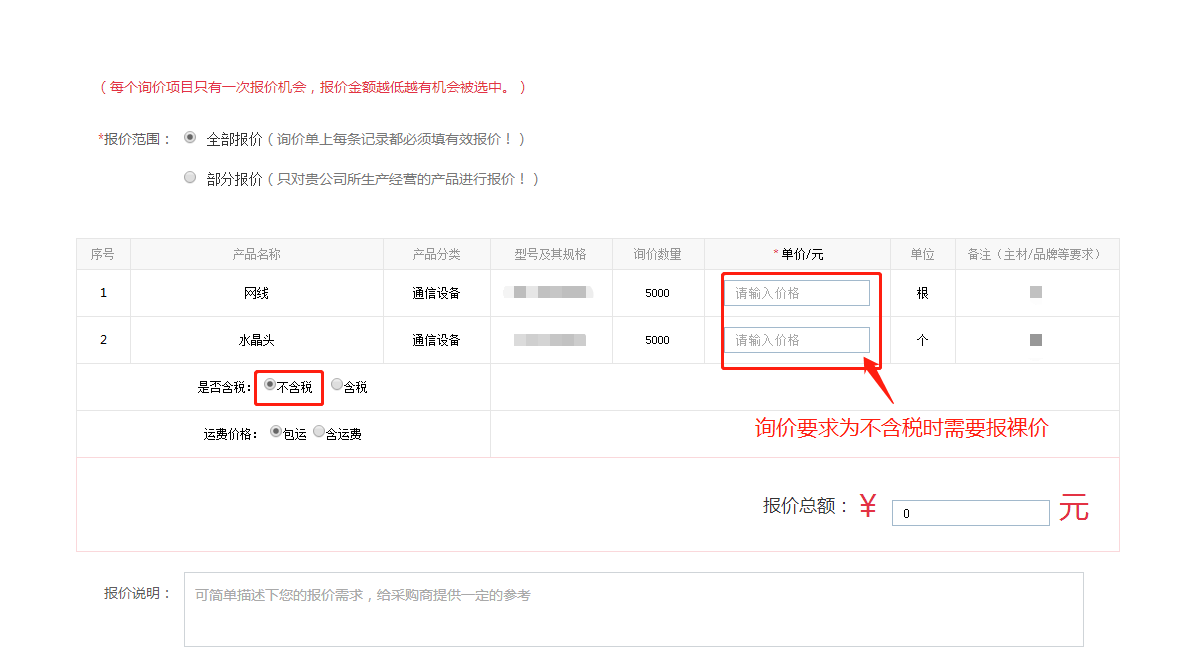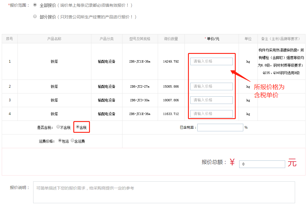 一、當(dāng)采購商發(fā)布的詢價單為含稅時,供應(yīng)商所填寫的單價須為含稅單價。同時要填寫含稅價格的已含稅率情況。